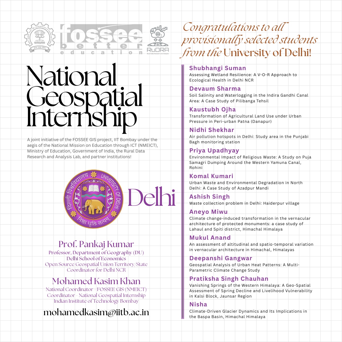 - The following is the tentative/provisional list of candidates shortlisted for the National Geospatial Internship, which comes under Batch 03 (Students of National Geospatial Awards Winners, and Champions and Winners of IIT Bombay FOSSEE Geospatial Mapathon (Edition 03 (2023); 04 (2024) and 05 (2025))).